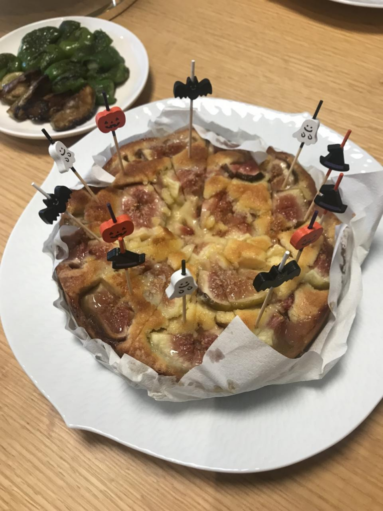 焼いていただいたいちじくのケーキとチョコレートケーキに飾り付け
